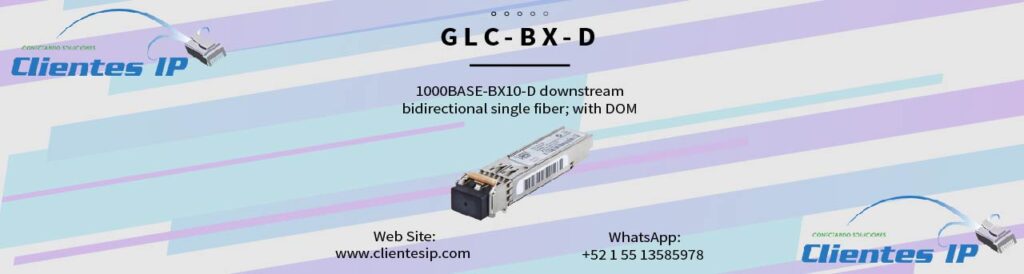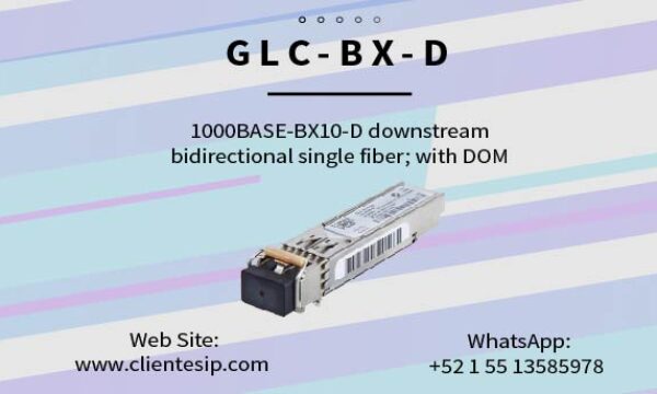 GLC-BX-D-I 1000BASE-BX10 SFP module, Downstream, Industrial Temp Descripción del módulo Cisco GLC-BX-D-I El GLC-BX-D-I es un módulo transceptor SFP (Small Form-Factor Pluggable) bidireccional diseñado para transmisión de datos en redes Gigabit Ethernet